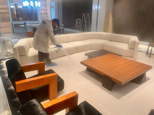 該大平層內(nèi)擺放各類高端家具、軟裝擺件與定制柜體,為避免施工過程中藥劑沾染、設(shè)備磕碰損傷家居,創(chuàng)綠家施工團隊率先開展全場景、精細化成品保護工作:對高端家具、藝術(shù)擺件、家電設(shè)備采用專用加厚防塵膜全覆蓋包裹并做好固定,對定制柜體表面、實木地板進行防刮花防護處理,對門窗、開關(guān)、插座等細節(jié)部位精準(zhǔn)包裹,對軟裝織物、窗簾等進行密封收納,同時對施工區(qū)域進行分區(qū)隔離,全程輕裝作業(yè),在筑牢施工安全防線的同時,***限度守護業(yè)主的家居品質(zhì)。